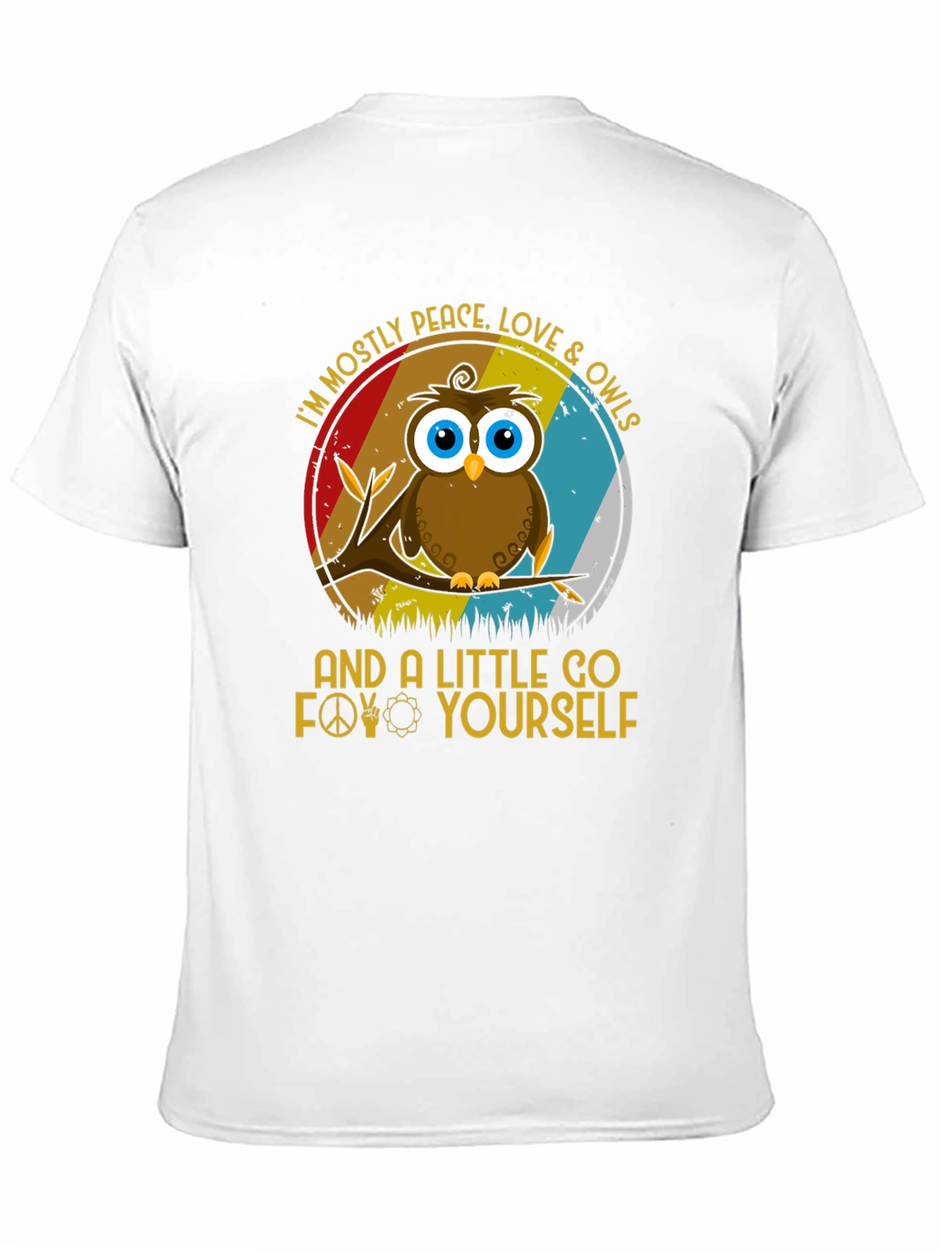 Muestra tu amor por la paz, el amor y los búhos con esta camiseta única. Presenta un adorable búho de dibujos animados sentado en una rama, con un diseño retro y la frase "I'm mostly peace, love & owls, and a little go f*ck yourself". Perfecta para aquellos con un sentido del humor peculiar y un amor por la naturaleza. Fabricada con materiales de alta calidad para una comodidad duradera, esta camiseta es ideal para el uso diario, festivales de música, o simplemente para relajarse en casa. ¡Expresa tu individualidad con esta prenda llamativa y divertida!