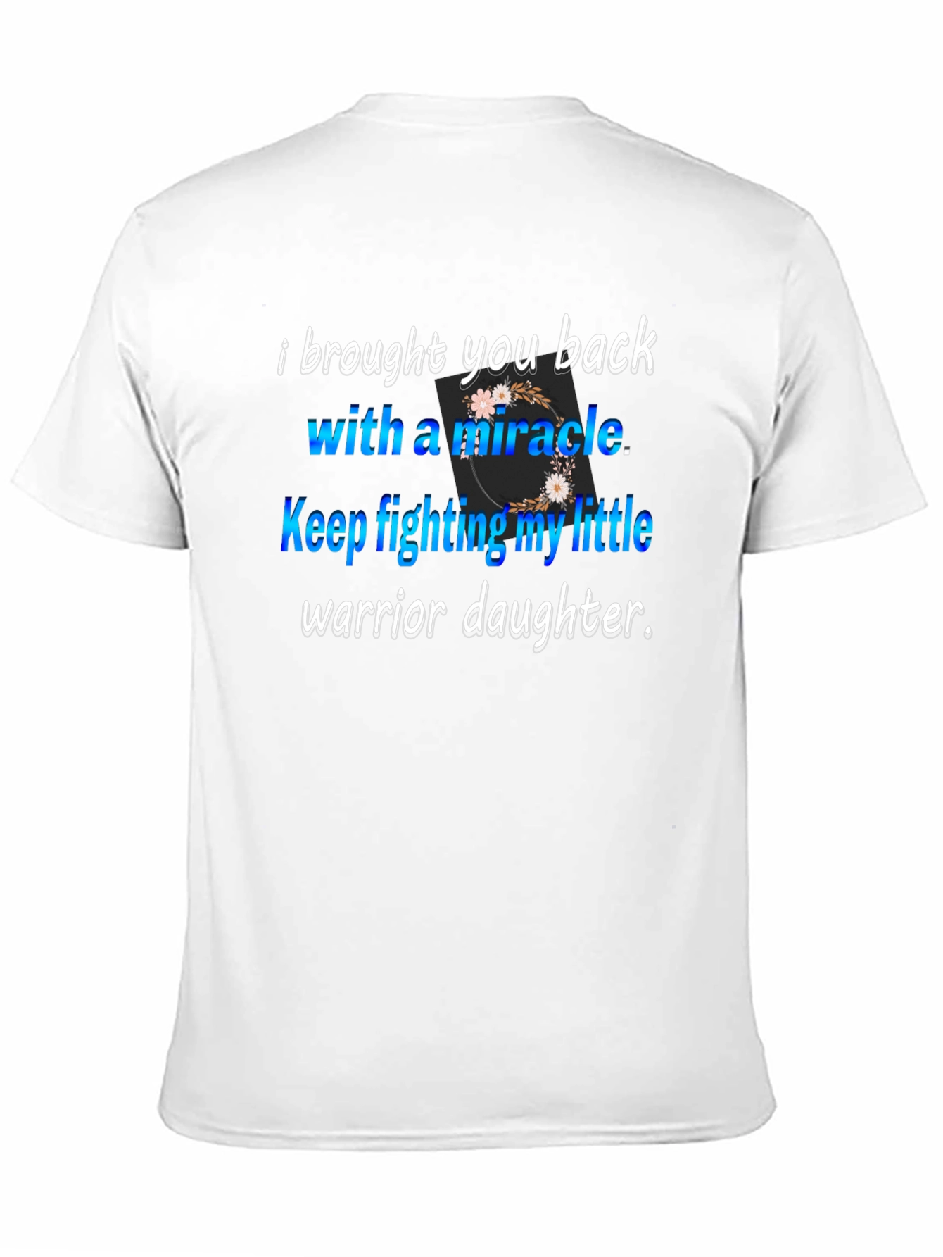 Muestra tu amor y apoyo con esta conmovedora camiseta. Con un diseño emotivo que dice "Te traje de vuelta con un milagro. Sigue luchando mi pequeña hija guerrera", esta prenda es perfecta para padres orgullosos y esperanzados. La camiseta negra presenta un estampado llamativo en letras blancas y azules, creando un efecto visual impactante. Ideal para uso diario, eventos de concienciación o simplemente para expresar un mensaje poderoso. Fabricada con materiales suaves y cómodos, esta camiseta ofrece un ajuste relajado y duradero. ¡Lleva tu mensaje con estilo y compasión!