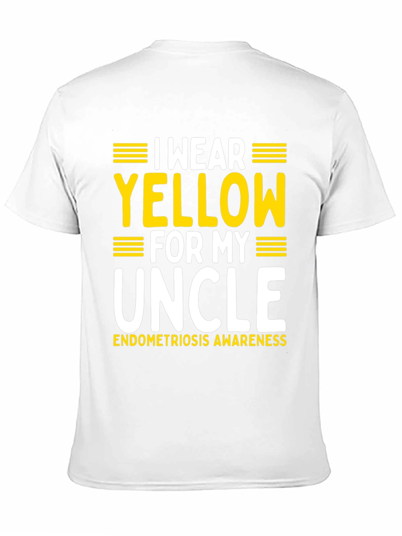 Muestra tu apoyo con esta elegante camiseta negra "Amarillo por mi Tío". Con un llamativo diseño en amarillo y blanco, la camiseta presenta la frase completa: "I WEAR YELLOW FOR MY UNCLE ENDOMETRIOSIS AWARENESS" (Llevo amarillo por mi tío, conciencia sobre la endometriosis). Fabricada con materiales suaves y cómodos, esta camiseta es perfecta para concienciar sobre la endometriosis y mostrar solidaridad. Ideal para llevarla en eventos de concienciación, reuniones familiares o simplemente para el día a día. Una forma moderna y significativa de apoyar una causa importante.