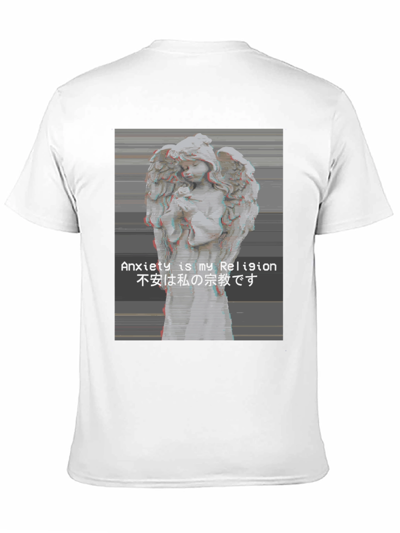 Esta camiseta negra presenta un diseño llamativo y moderno con un estilo vaporwave. En el centro, se observa la imagen de un ángel con un efecto visual distorsionado, creando un ambiente misterioso e intrigante. El texto "Anxiety is my Religion" (La ansiedad es mi religión) y su traducción japonesa añaden un toque edgy y alternativo. Ideal para expresar tu individualidad y destacar entre la multitud, esta camiseta es perfecta para usar en conciertos, salidas casuales o simplemente para añadir un toque único a tu estilo diario. Su color negro facilita la combinación con cualquier prenda y accesorio. Fabricada con materiales suaves y cómodos para un uso prolongado.